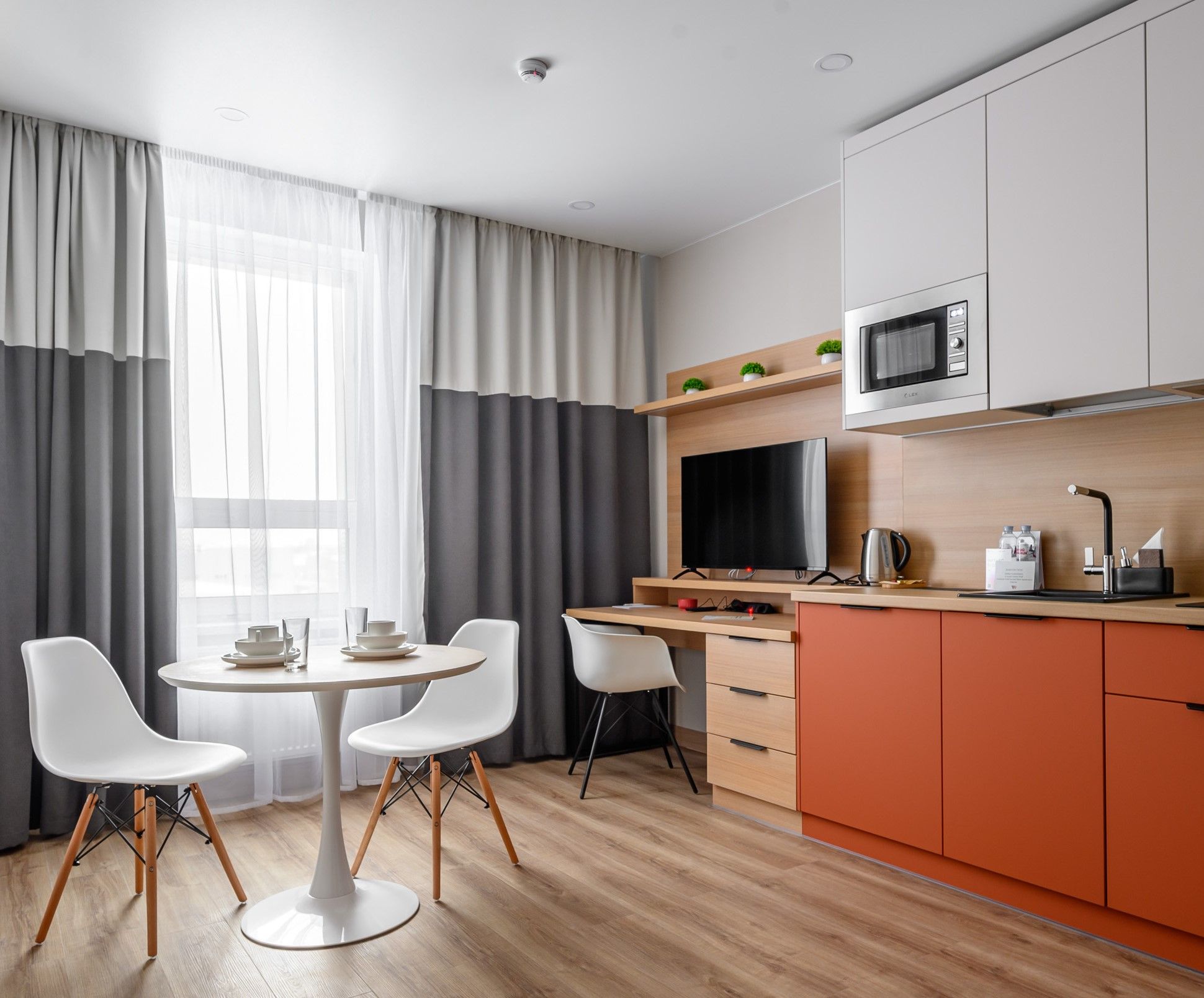 В суете большого города так важно найти место, где можно побыть собой. В апартаментах Deluxe площадью 32–38 м² хватает воздуха и света для двоих, а если нужно — и для троих. Здесь каждый найдёт свой уголок: кто-то устроится с книгой за круглым столом, кто-то — за рабочим столом с ноутбуком, а кто-то просто будет лежать на мягкой кровати и смотреть в потолок, наслаждаясь тишиной.