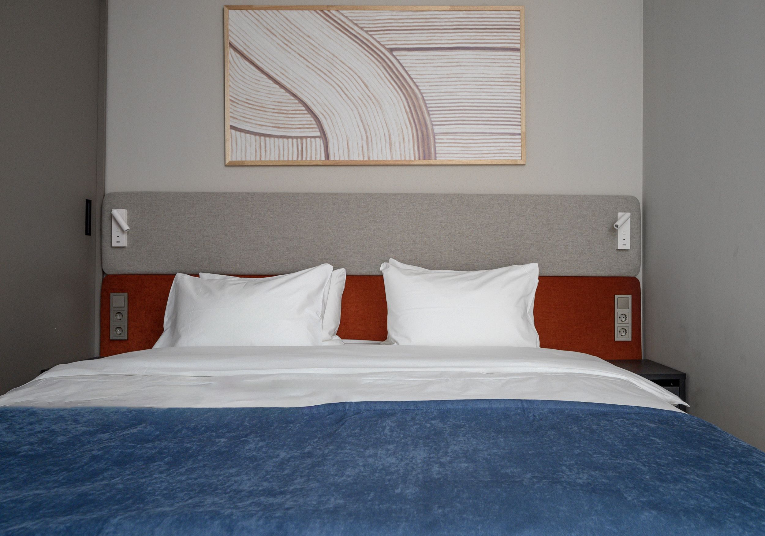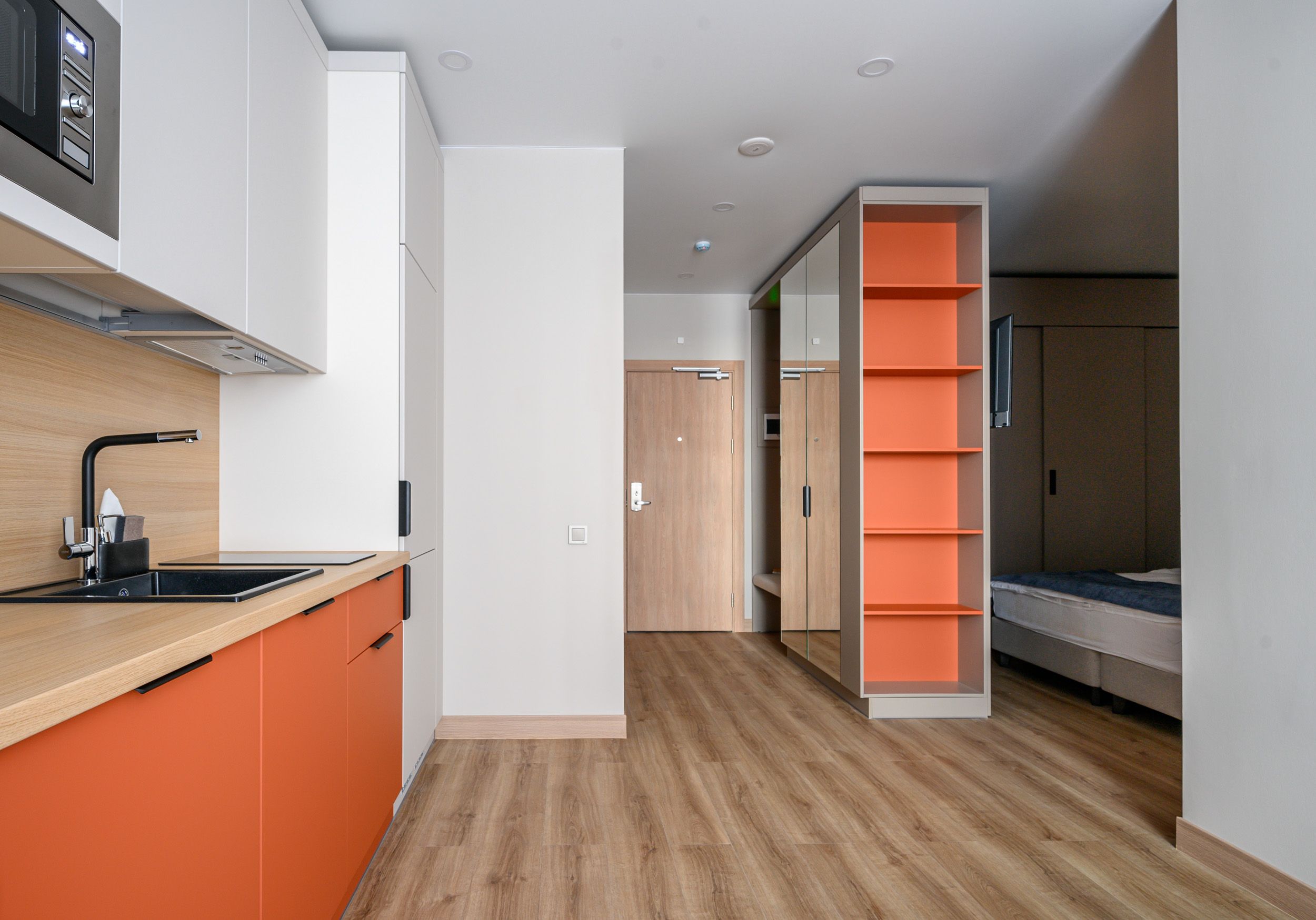 В Corner всё устроено иначе, чем в обычных номерах. Здесь нет глухих стен, но есть умное зонирование. Спальня плавно перетекает в гостиную, кухня — в обеденную зону, а рабочий стол стоит ровно там, где удобно вам. Пространство дышит и движется вместе с вами.