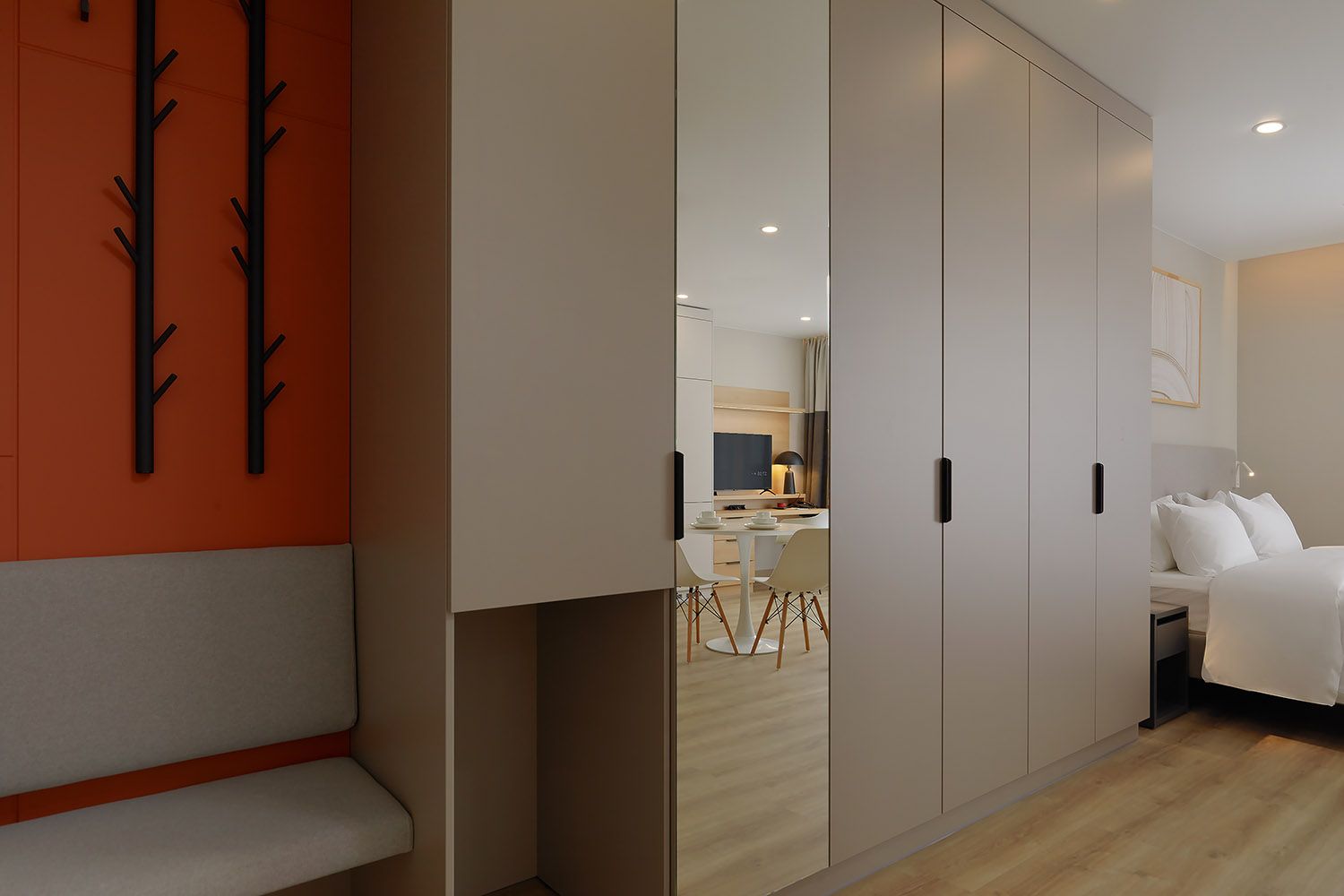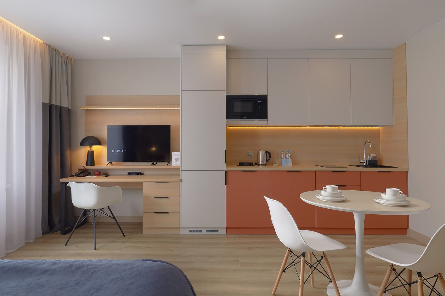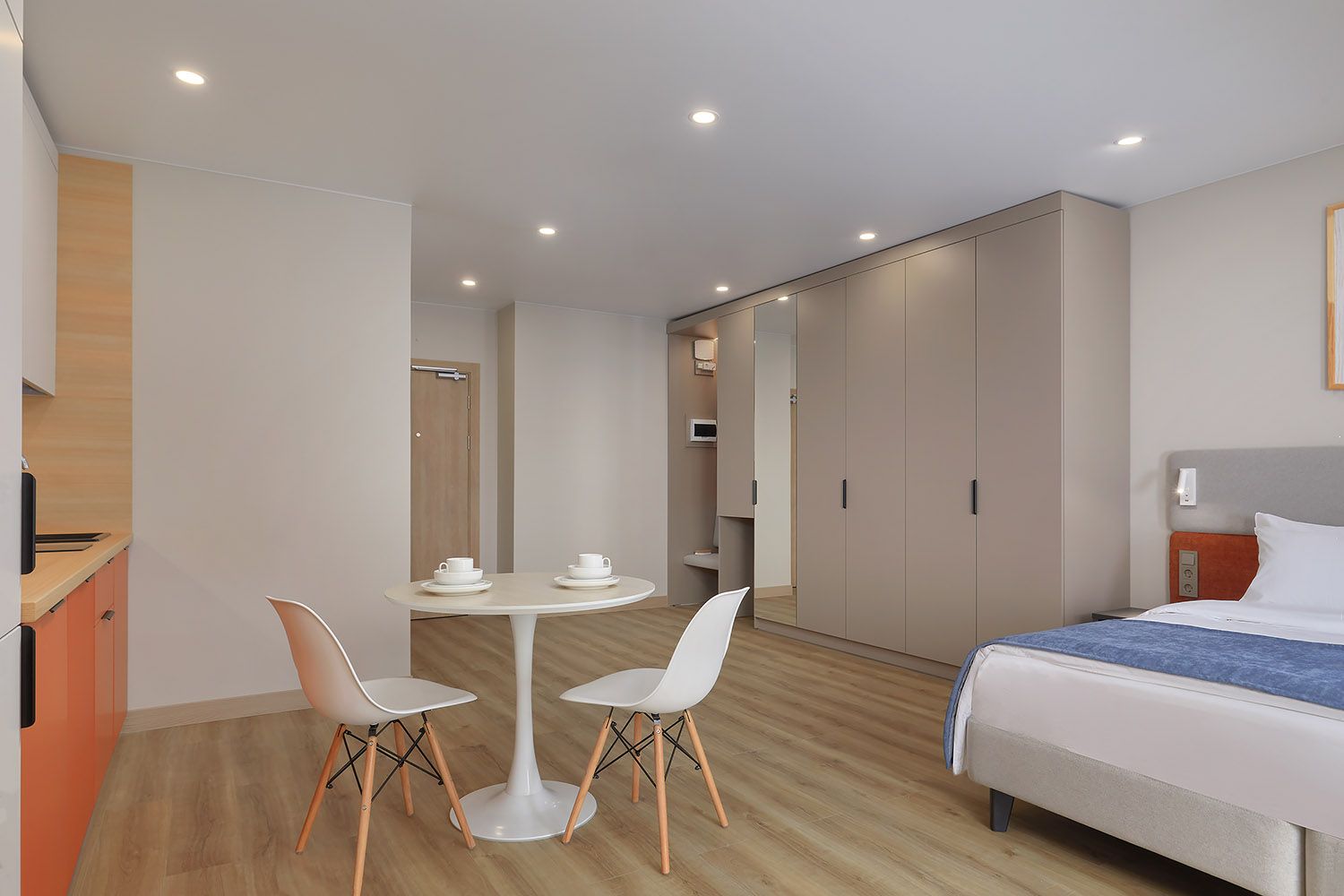 В суете большого города так важно найти место, где можно побыть собой. В апартаментах Deluxe площадью 32–38 м² хватает воздуха и света для двоих, а если нужно — и для троих. Здесь каждый найдёт свой уголок: кто-то устроится с книгой за круглым столом, кто-то — за рабочим столом с ноутбуком, а кто-то просто будет лежать на мягкой кровати и смотреть в потолок, наслаждаясь тишиной.