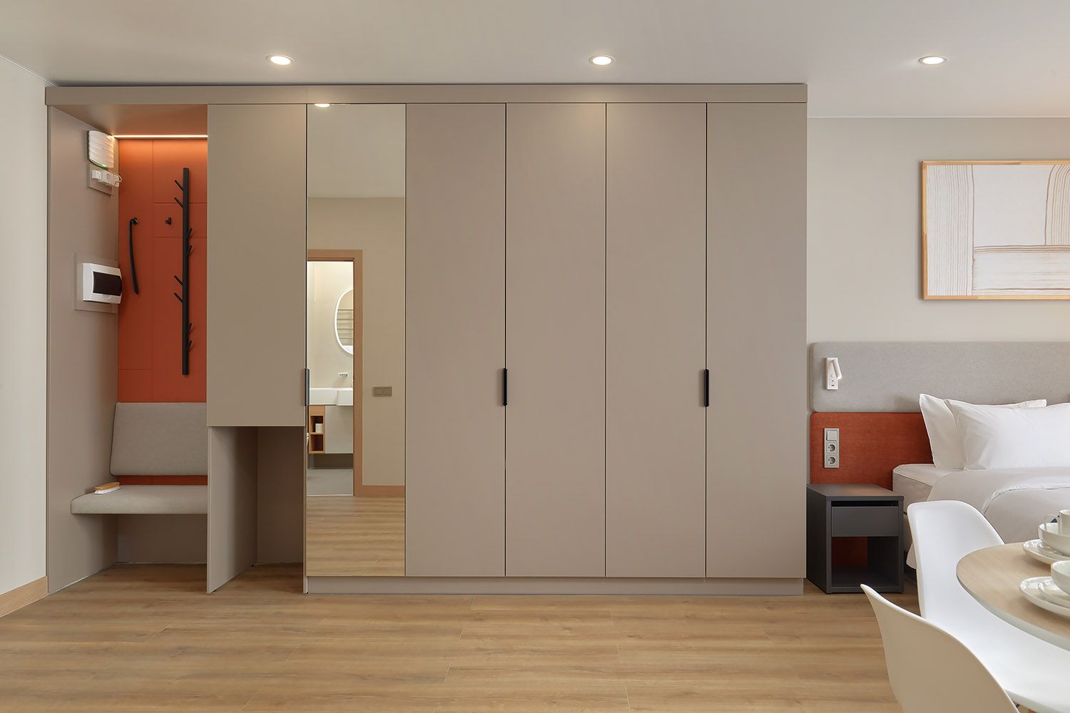 Вместительный шкаф с полками, вешалками и ящиками легко вместит гардероб двоих гостей на неделю и дольше. Чемодан убирается с глаз долой — в номере не валяются сумки и пакеты, только аккуратность и порядок. Приятно возвращаться в такое пространство после прогулки.