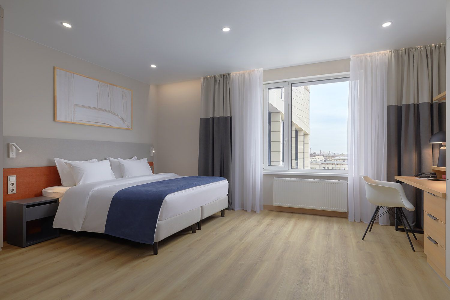 Апартаменты Deluxe площадью 32–38 м² созданы для тех, кто ценит пространство и домашний уют. В спальне — одна двуспальная или две раздельные кровати с мягким изголовьем.