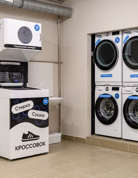 Для одежды — 4 стиральные и 4 сушильные машины. Для обуви — отдельная машина с режимами стирки и сушки. Всё современное, простое в управлении и всегда в вашем распоряжении.